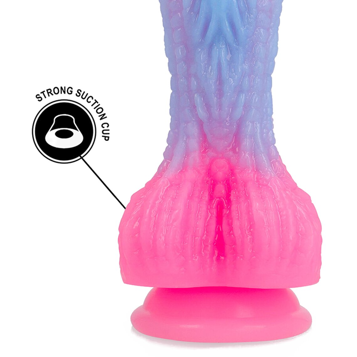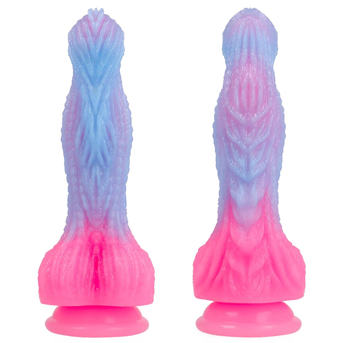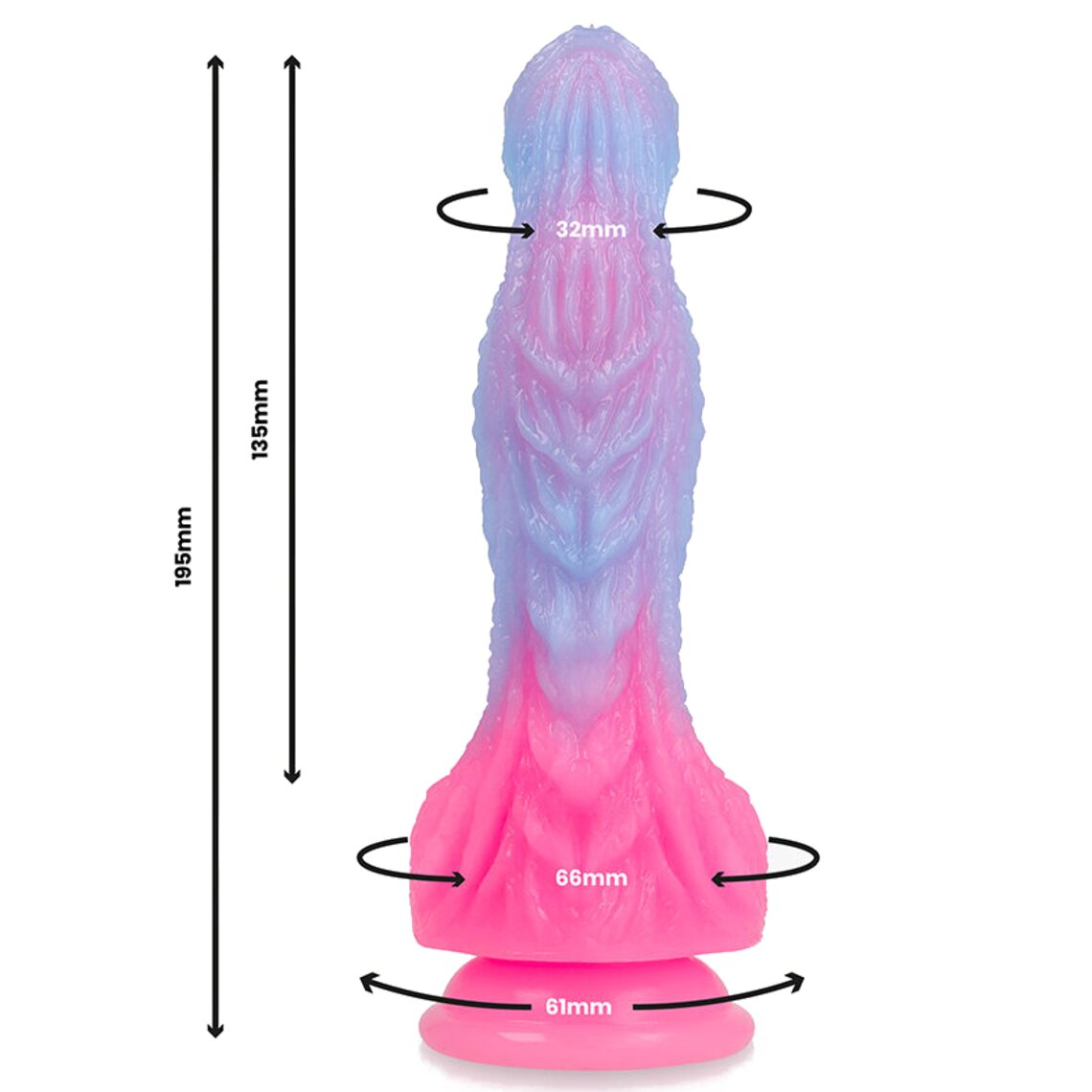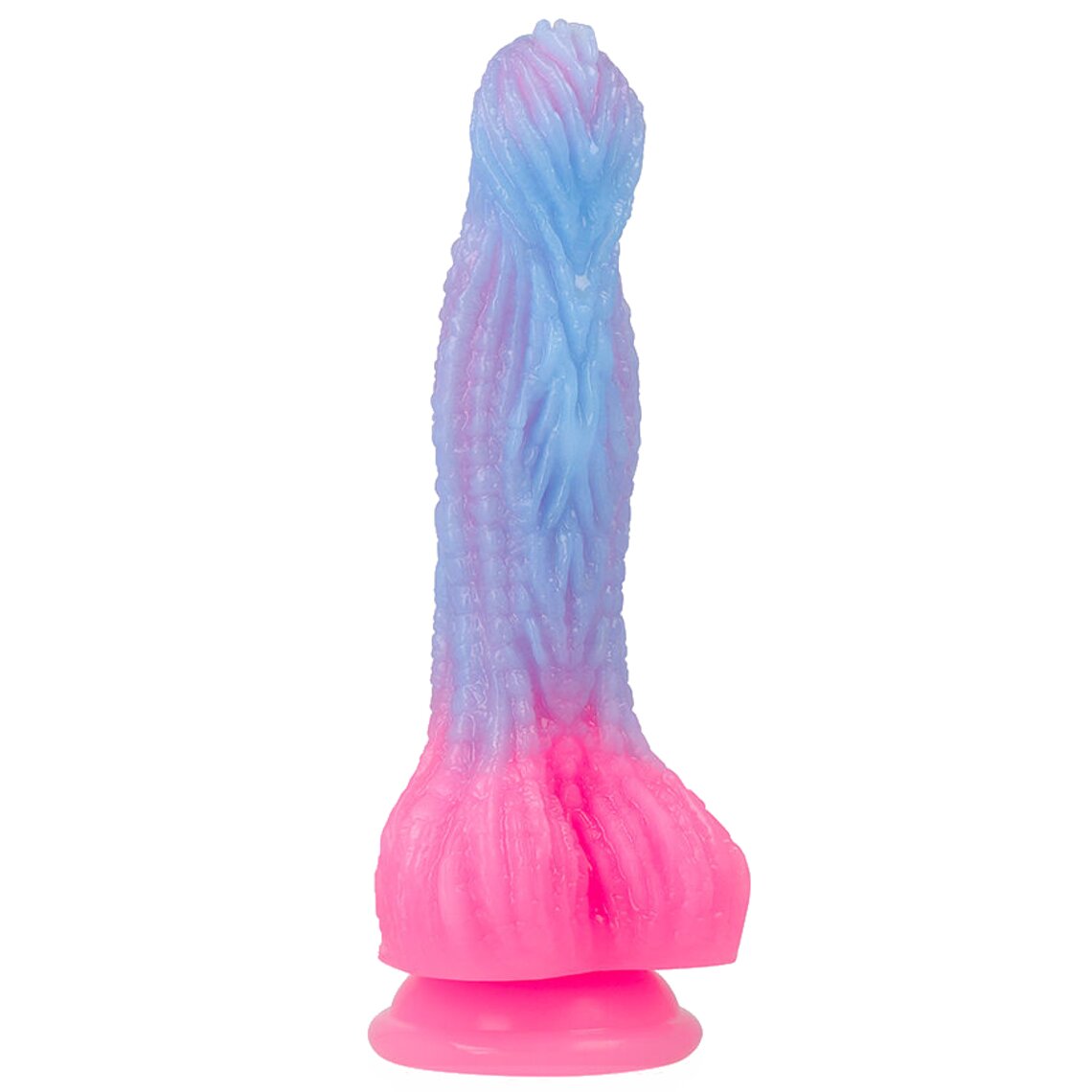 Dildo fantasy grande ispirato all’alba. Alto 19,5 cm. Azzurro e rosa.