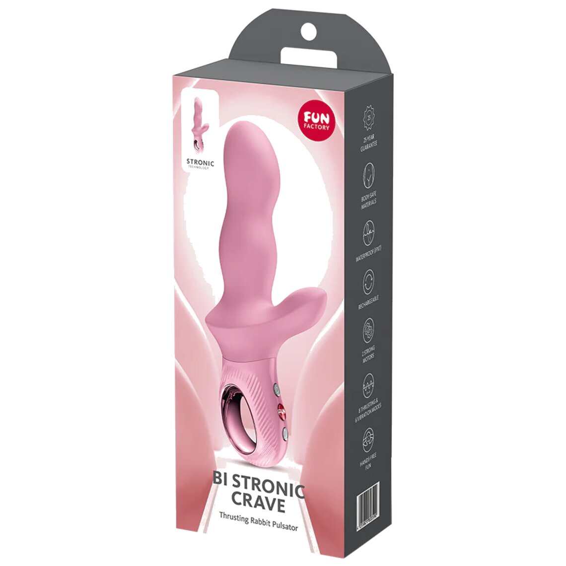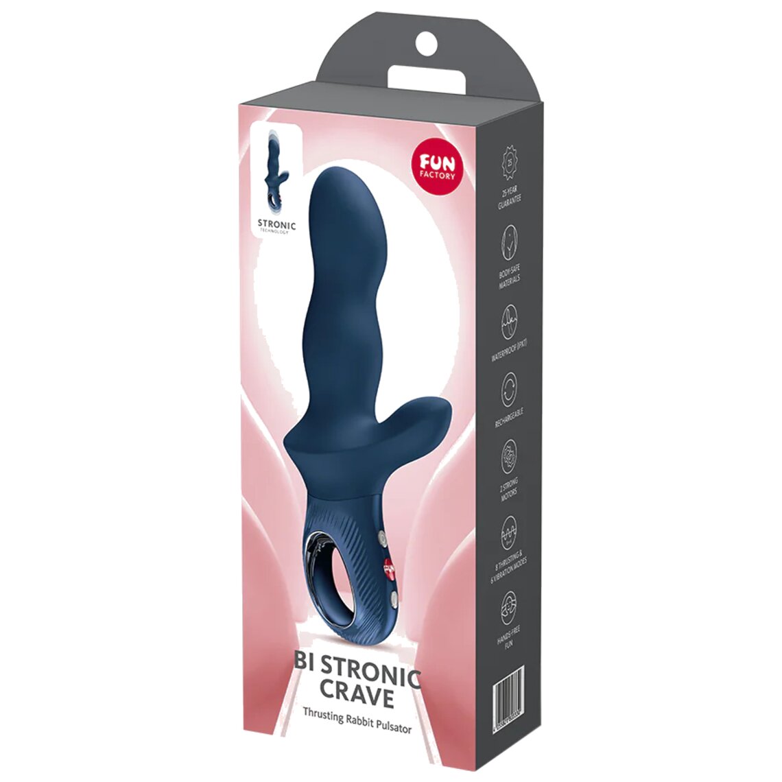 Da soli o in coppia, il BI STRONIC CRAVE si adatta perfettamente a qualsiasi fantasia ed è realizzato in silicone delicato sulla pelle per il massimo comfort. L'impugnatura ergonomica LOOP con superficie testurizzata, scanalata e antiscivolo ti offre il controllo quando lo desideri, mentre l'intuitiva interfaccia a 3 pulsanti rende tutto più semplice. Vuoi un livello superiore? Usa sempre un lubrificante a base d'acqua per sensazioni ancora più intense. Il BI STRONIC CRAVE è coperto da una garanzia FUN FACTORY di 25 anni, che garantisce qualità eccezionale, durata e divertimento senza fine.