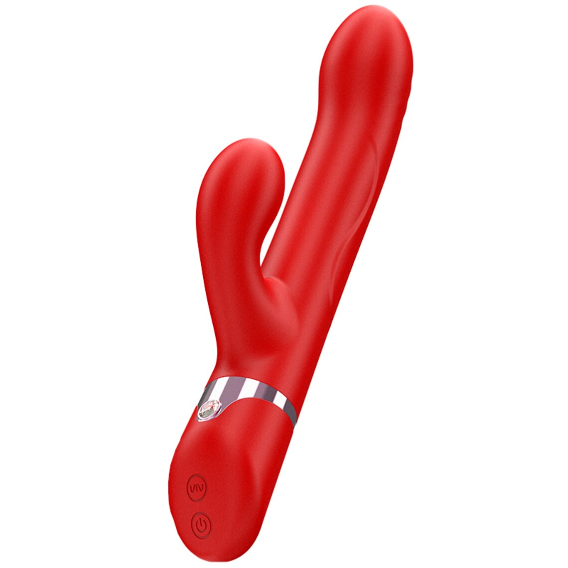 Vibratore multifunzionale per donna che combina rotazione, oscillazione e stimolazione simultanea.