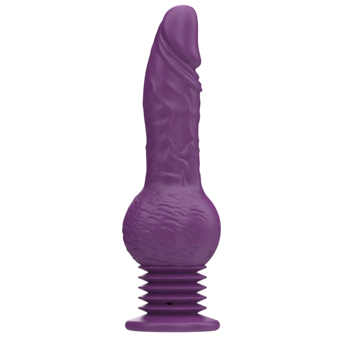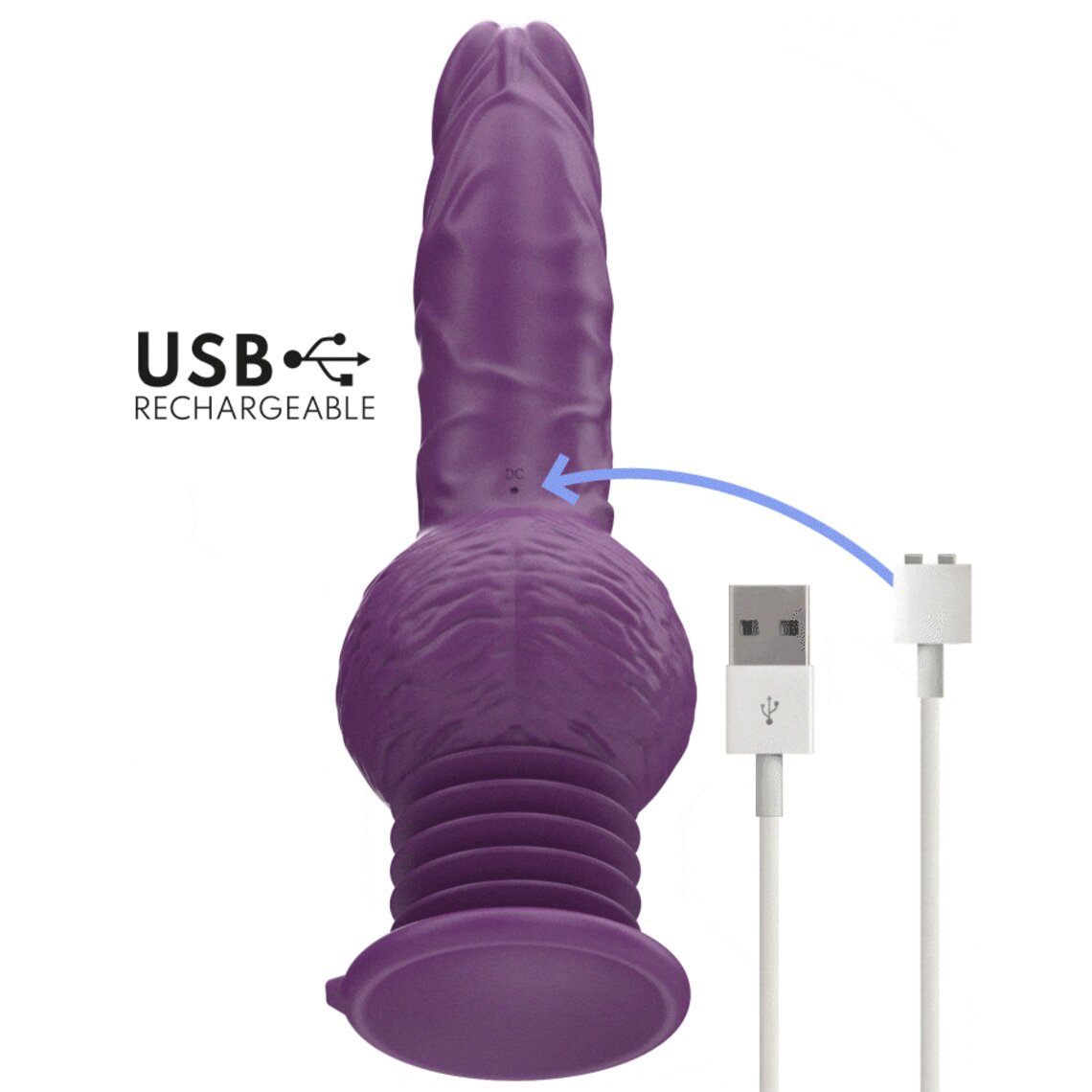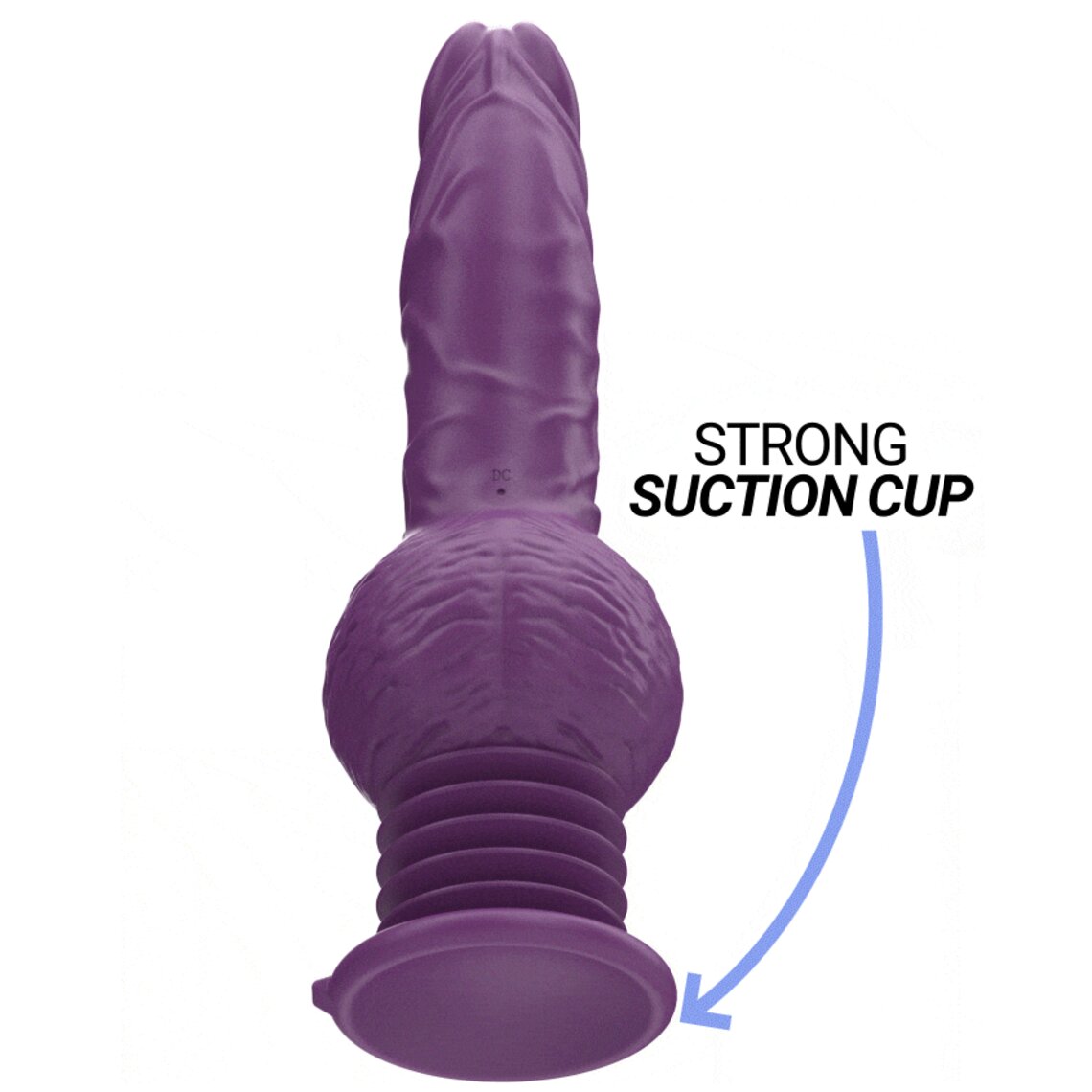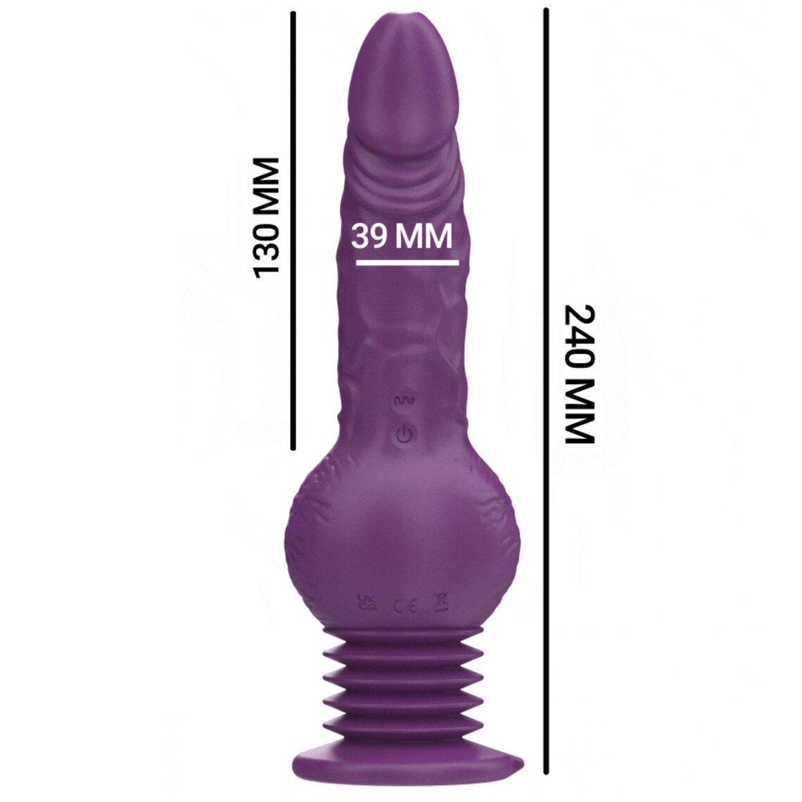 Dildo viola vibrante con due motori, funzione di spinta e base a ventosa.