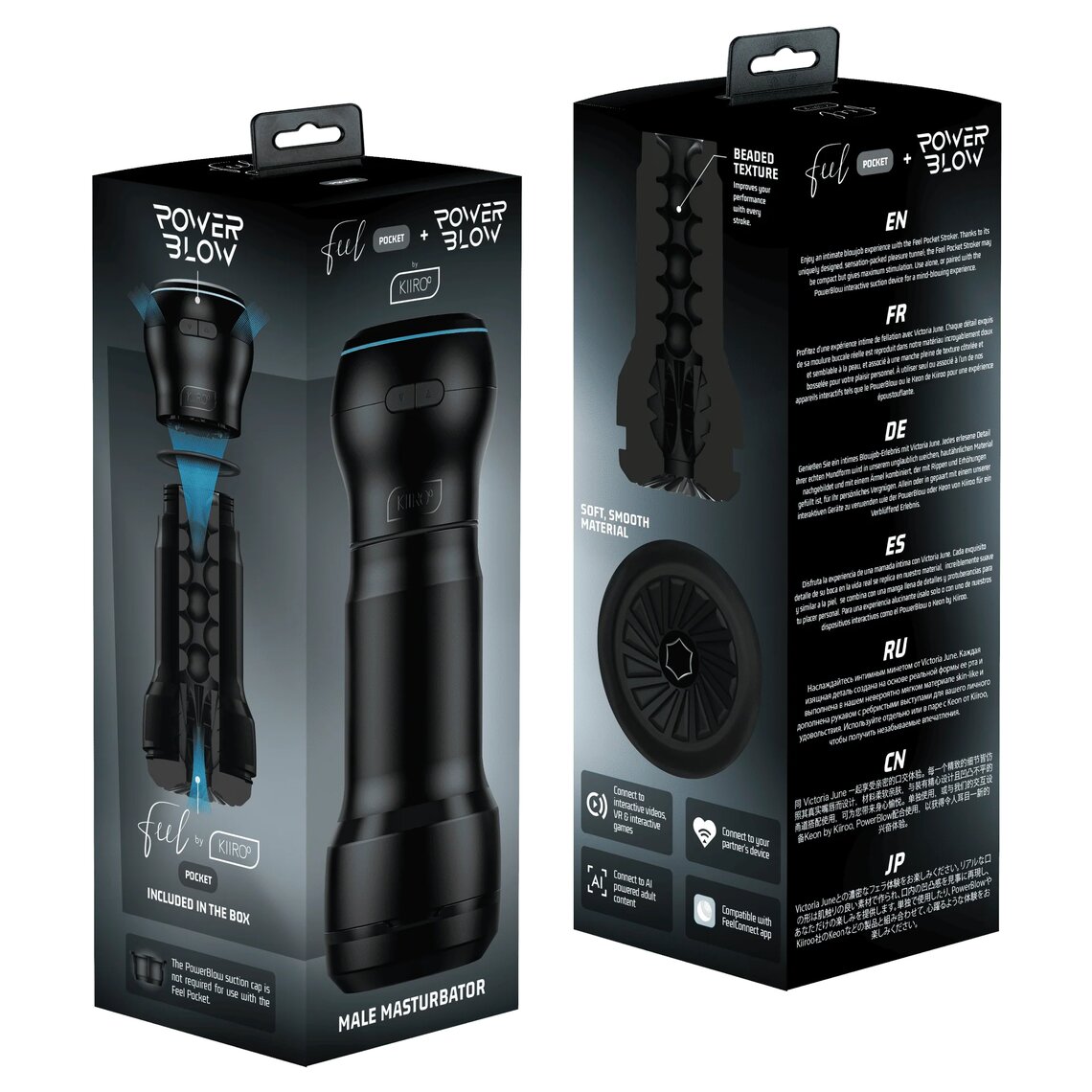 Questa scatola combinata viene fornita con Feel Pocket e il pluripremiato dispositivo di aspirazione di Kiiroo, PowerBlow, per offrire agli utenti le esperienze di pompino più intensamente piacevoli.