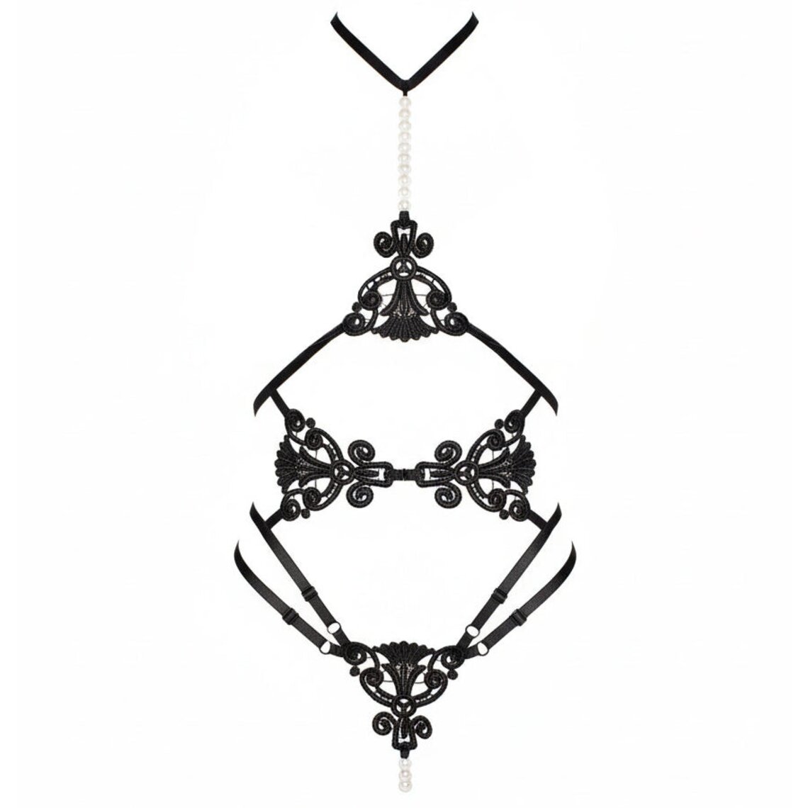 Body erotico a fasce nere con dettagli in pizzo e perle decorative.