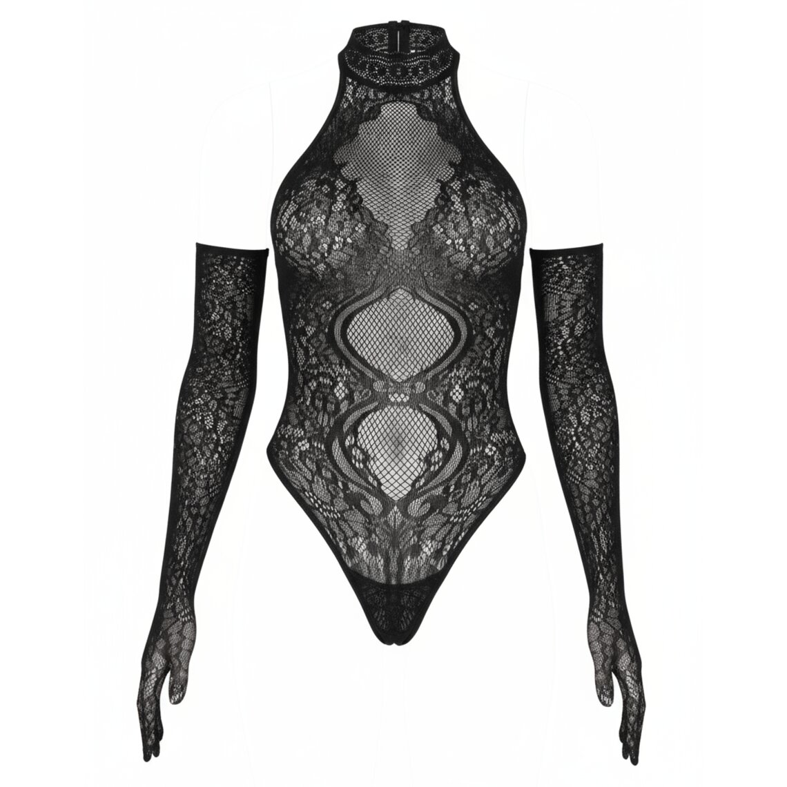 Elegante body nero in rete con collo aderente e guanti lunghi coordinati.