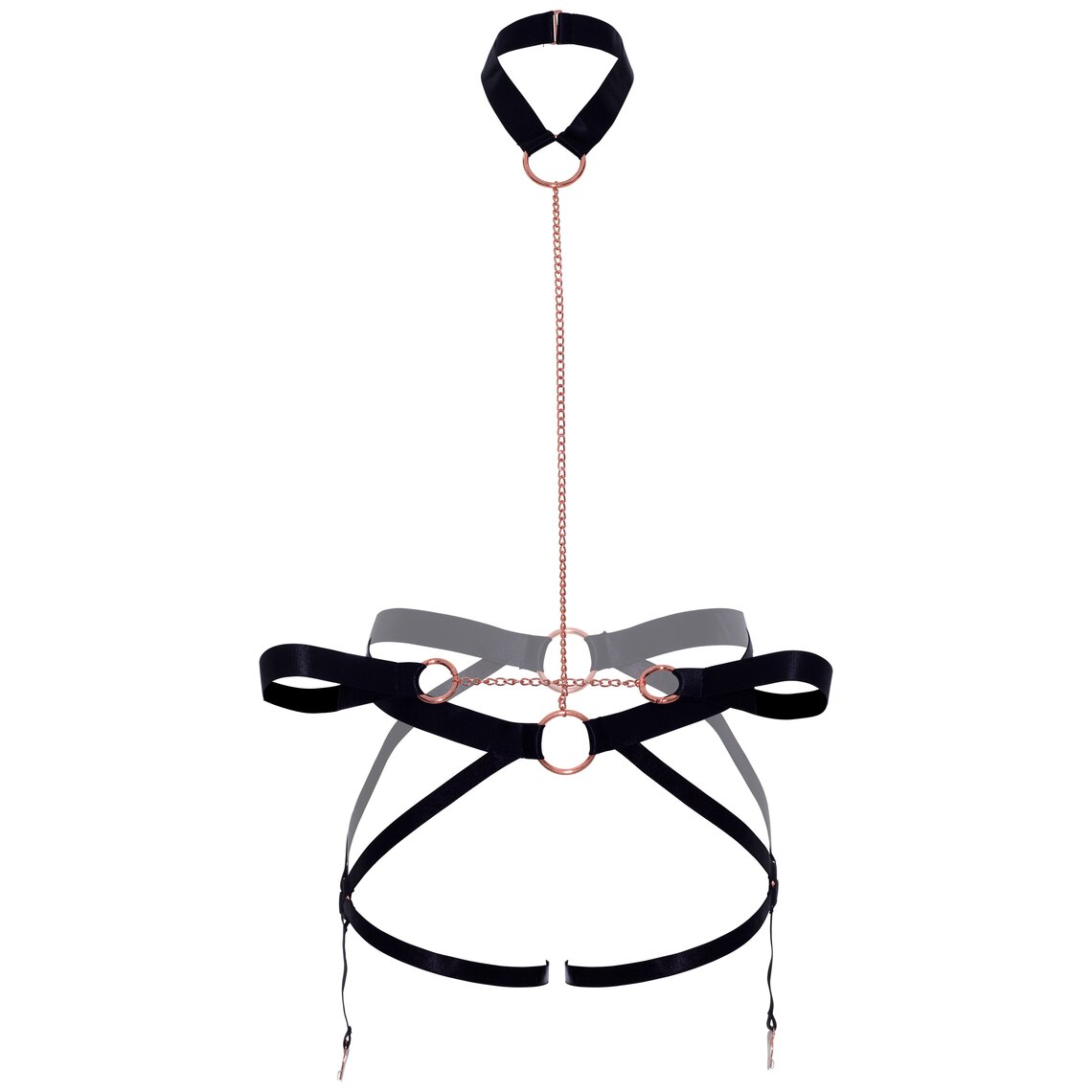 Set erotico con harness, catena per il torso e collarino per il collo.