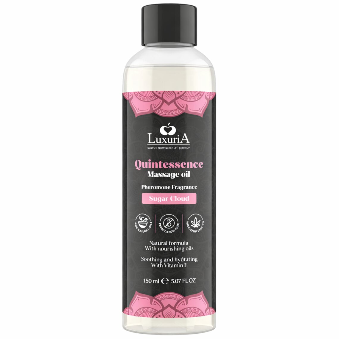 Quintessence Massage Oil, Sugar cloud Si tratta di un olio da massaggio naturale e raffinato, arricchito con formulazioni esclusive a base di oli di alta qualità ed essenze stimolanti accuratamente selezionate. La sua formula nutriente, realizzata con oli vegetali completamente naturali, abbinata ad aromi sensuali, fornisce un'idratazione intensa, lasciando la pelle morbida e profumata. Privo di paraffina, Quintessence Massage Oil rispetterà e proteggerà la pelle. la tua pelle grazie alla presenza di olio di semi di canapa, stimolando i tuoi sensi con morbide note di zucchero a velo che ti accompagneranno per tutto il massaggio, guidandoti verso la Quintessenza del piacere.