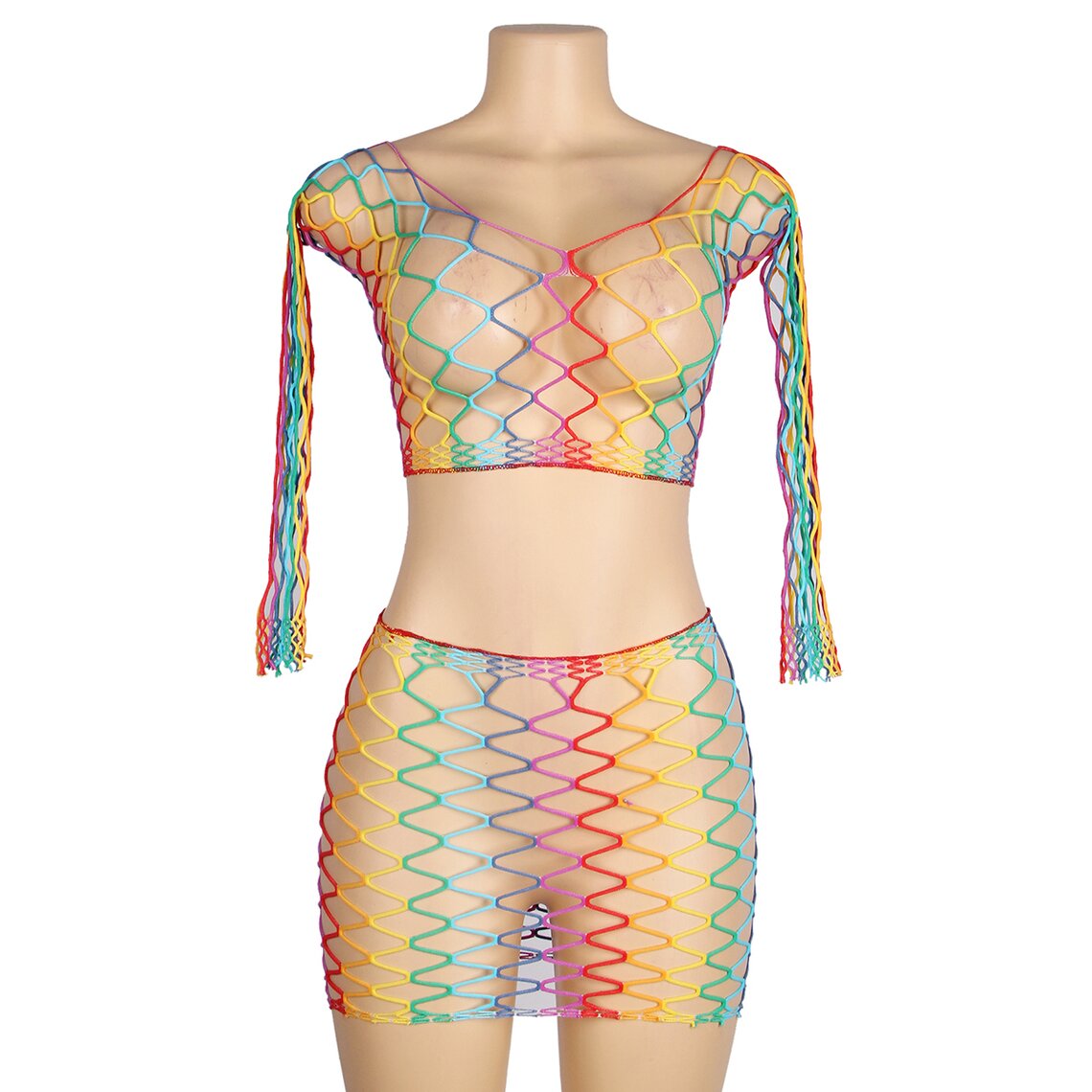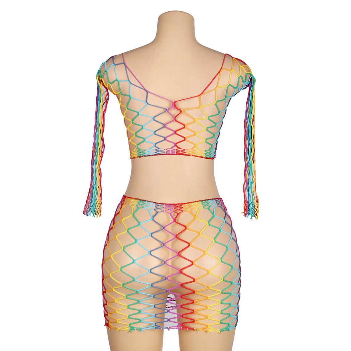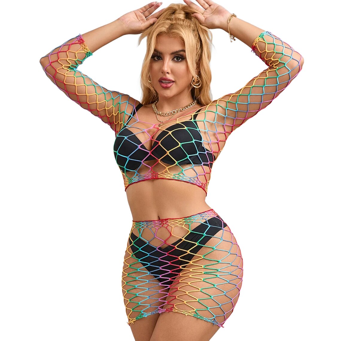 Completo di lingerie sexy in rete multicolore con maniche lunghe.
