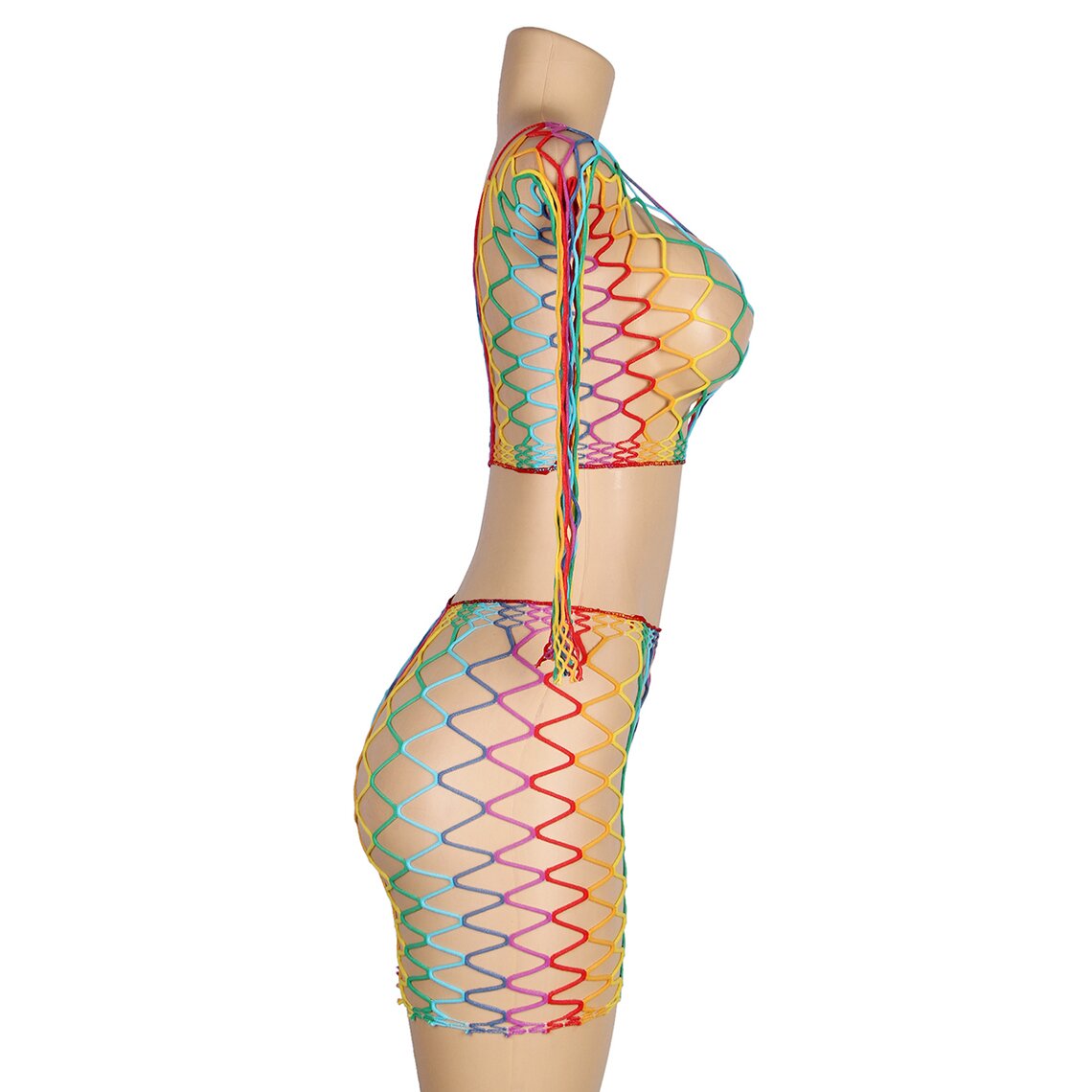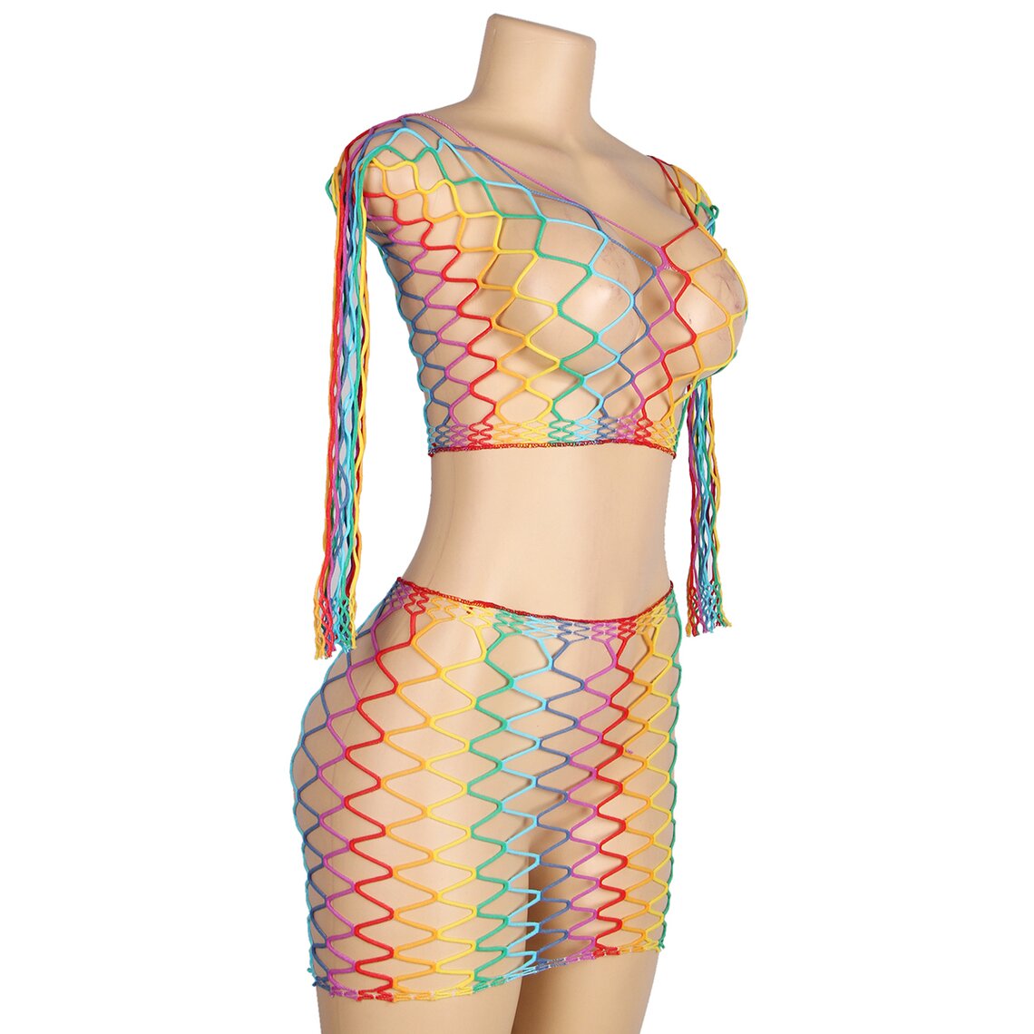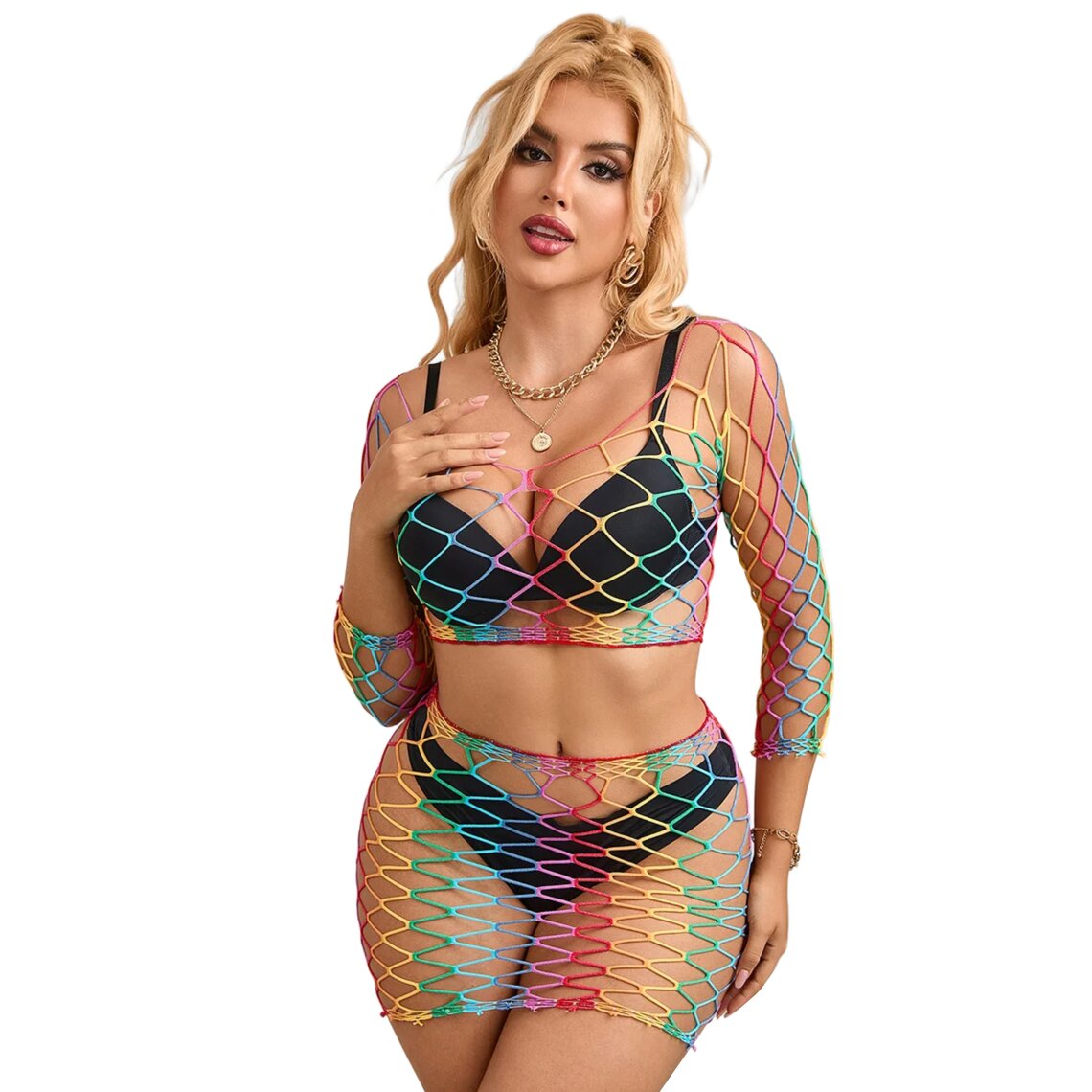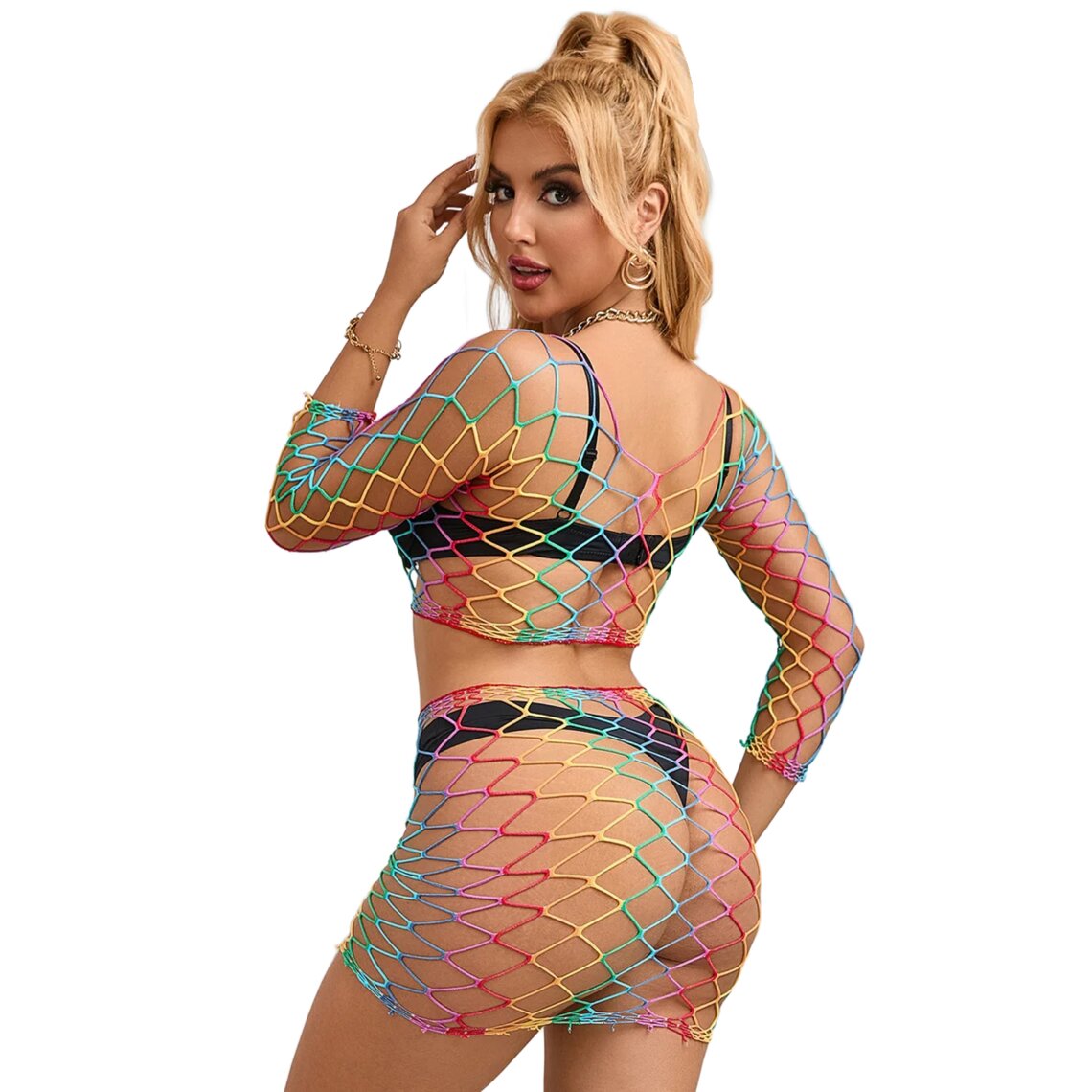 Completo di lingerie sexy in rete multicolore con maniche lunghe.